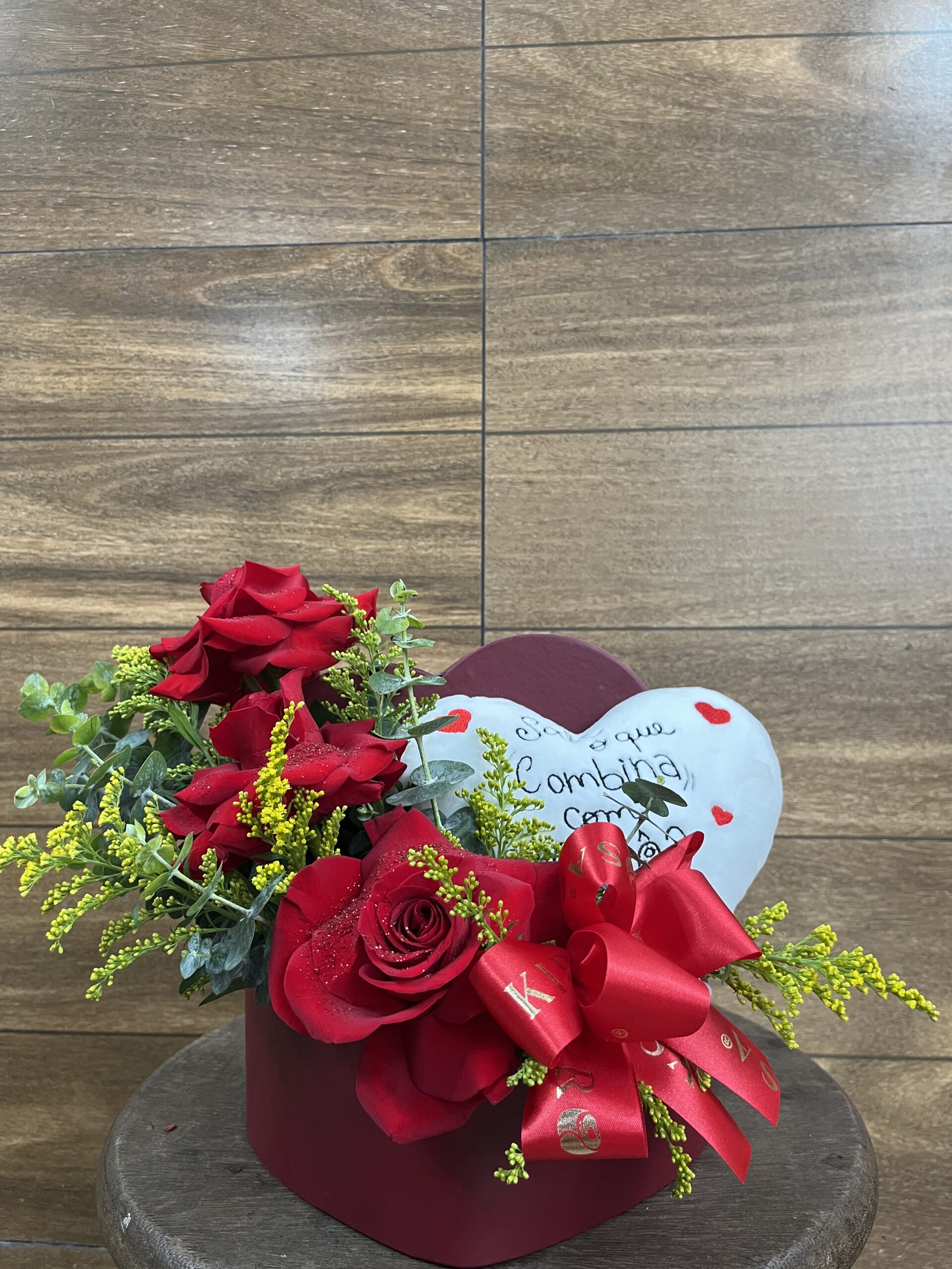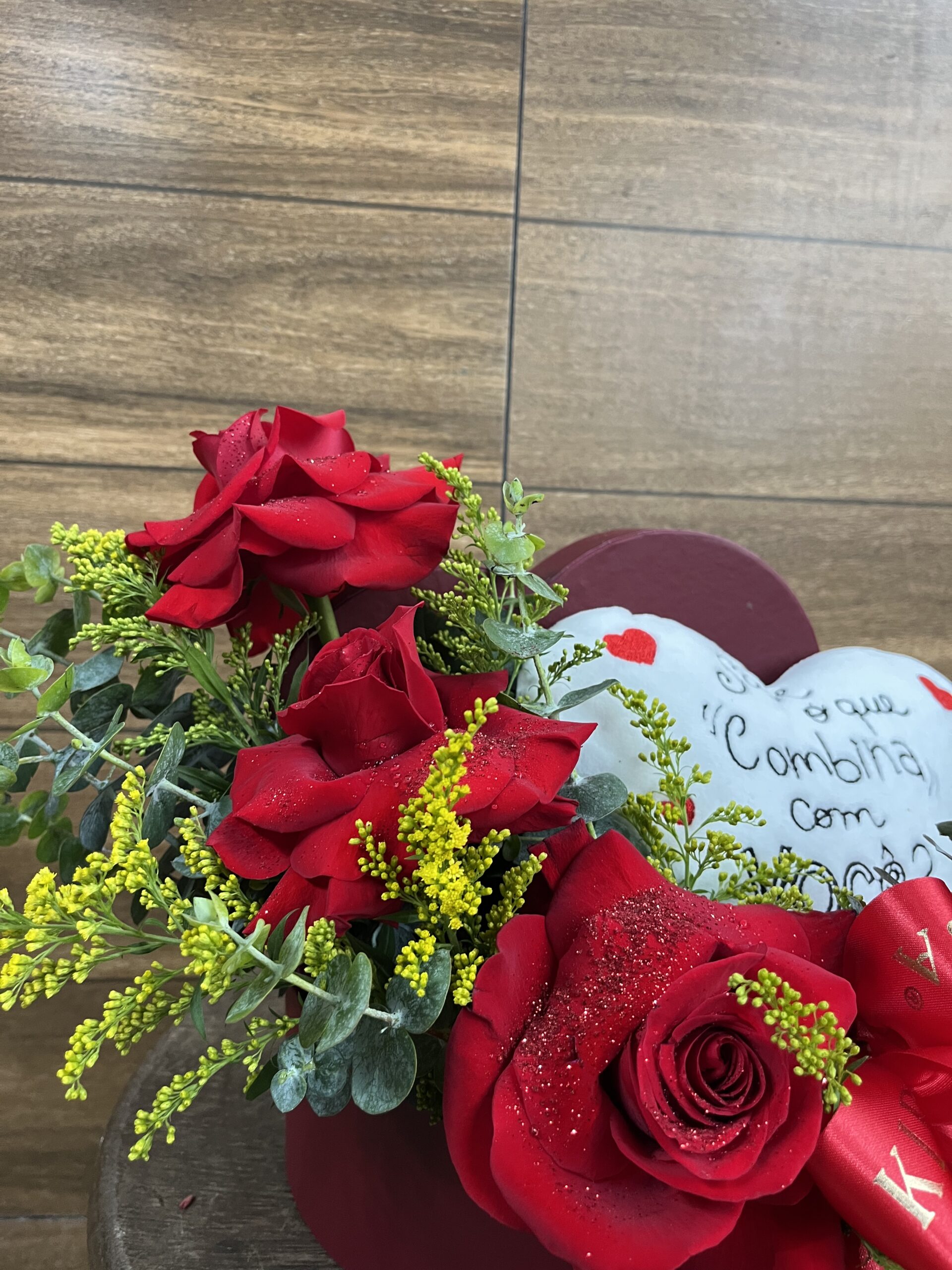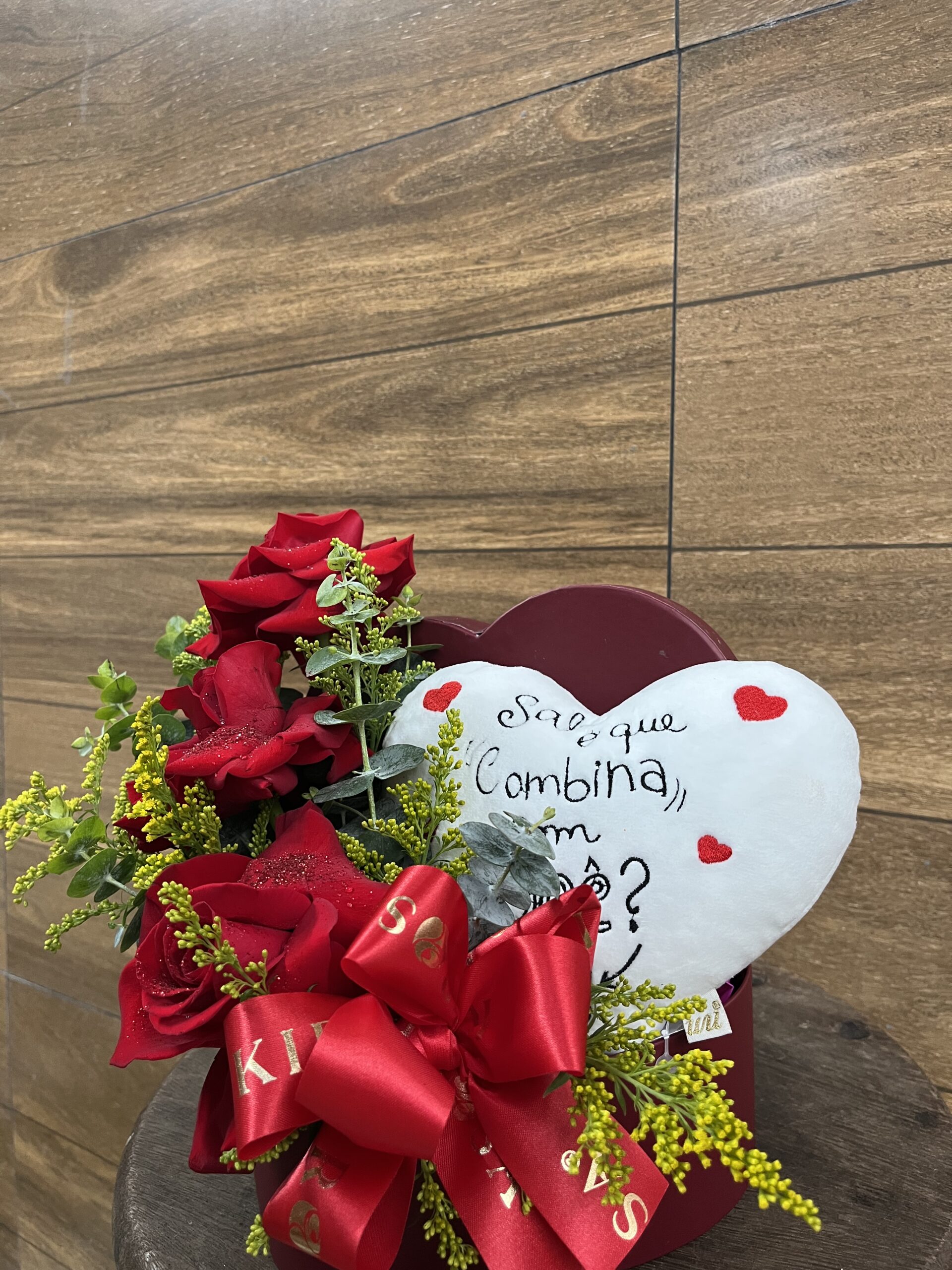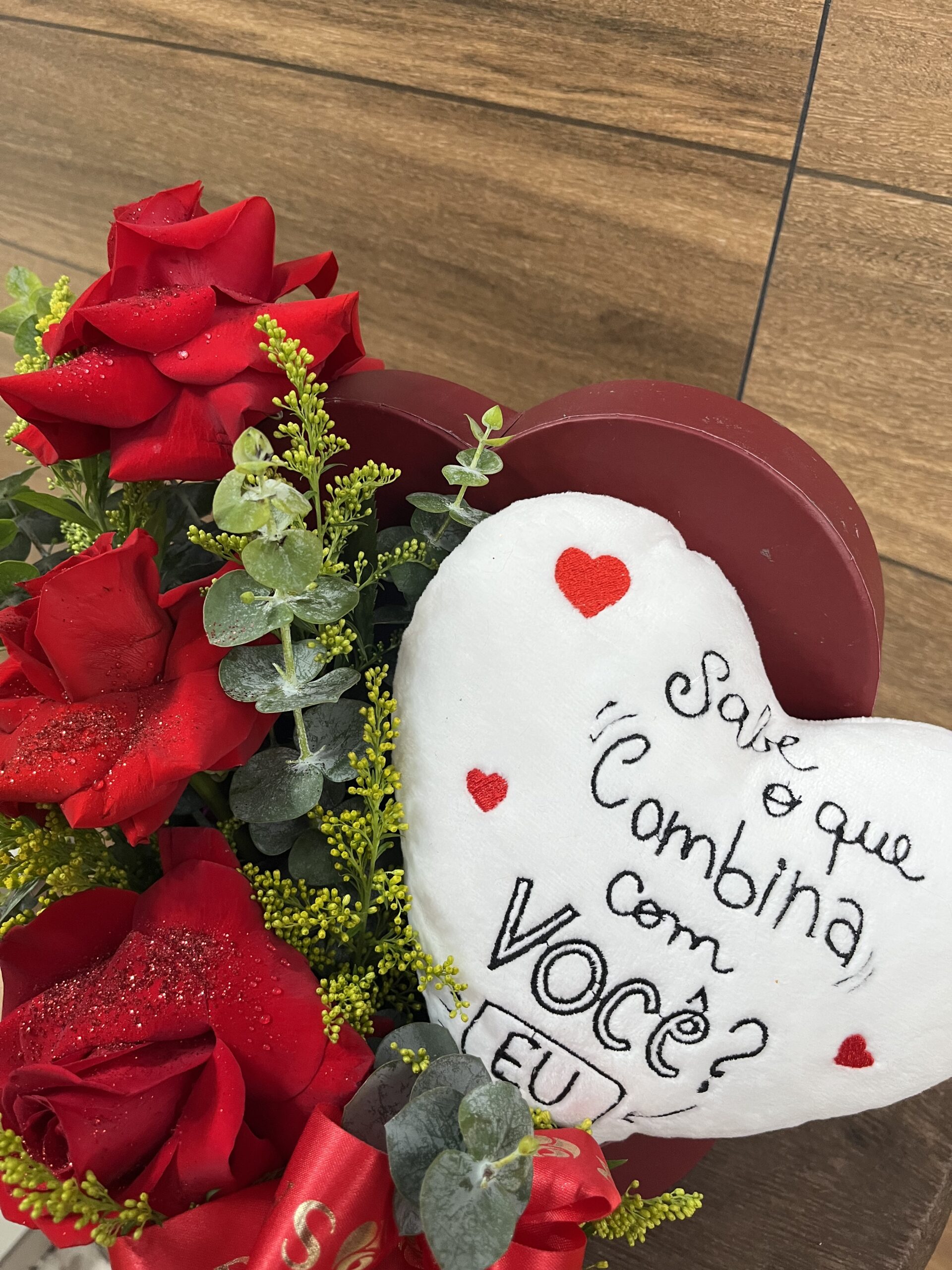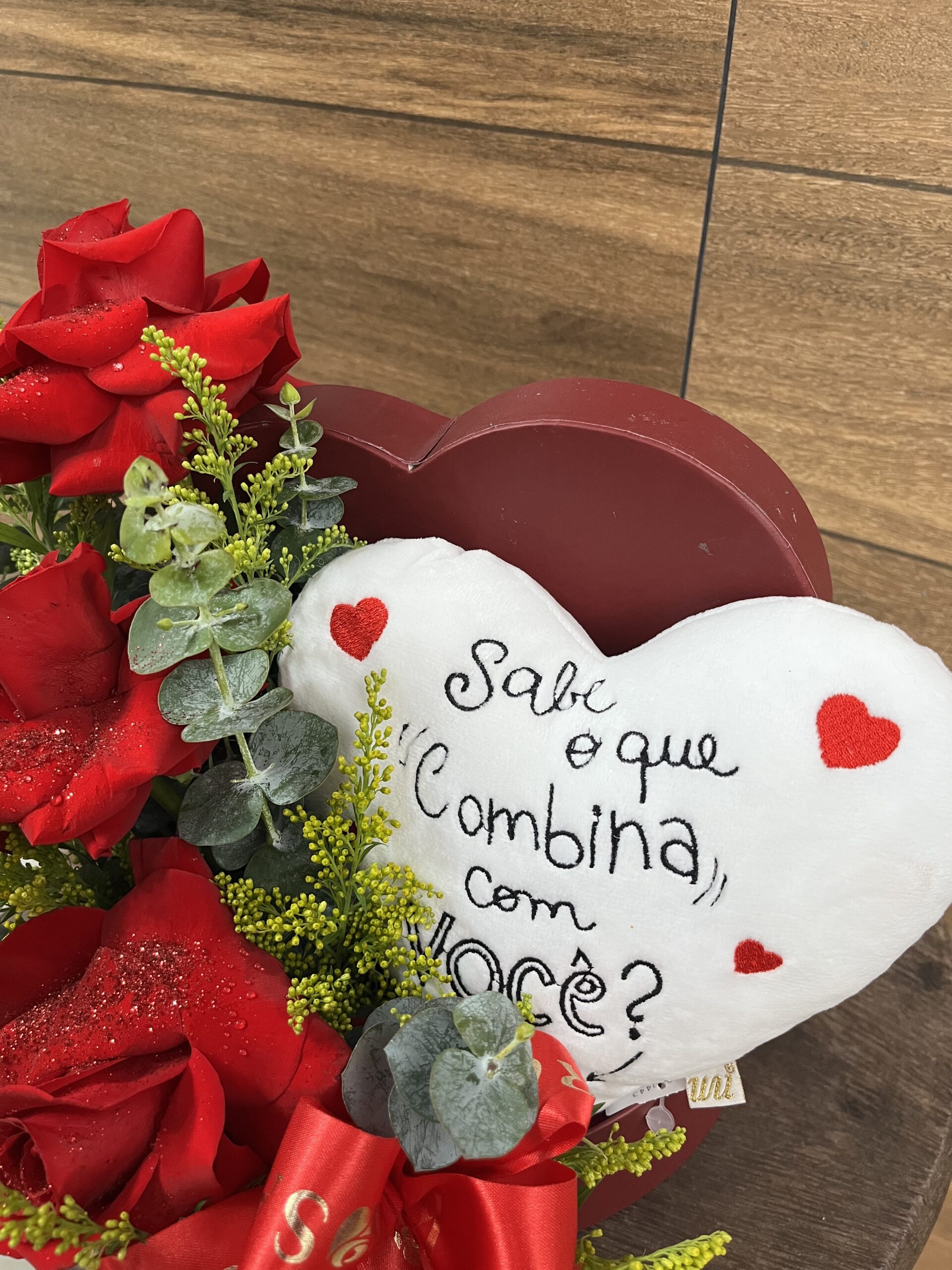 BOX coração branco de Pelúcia com Rosas Vermelhas