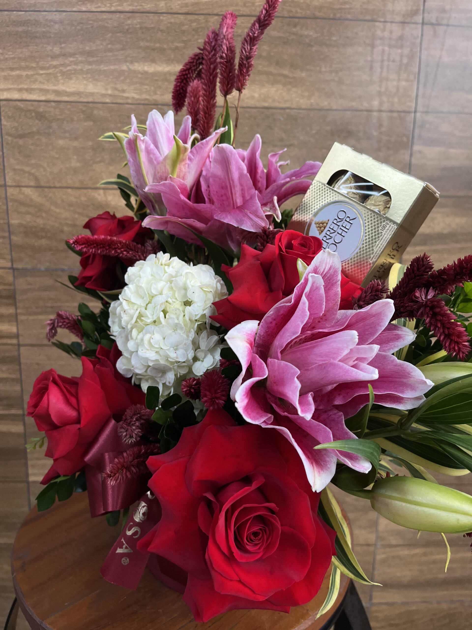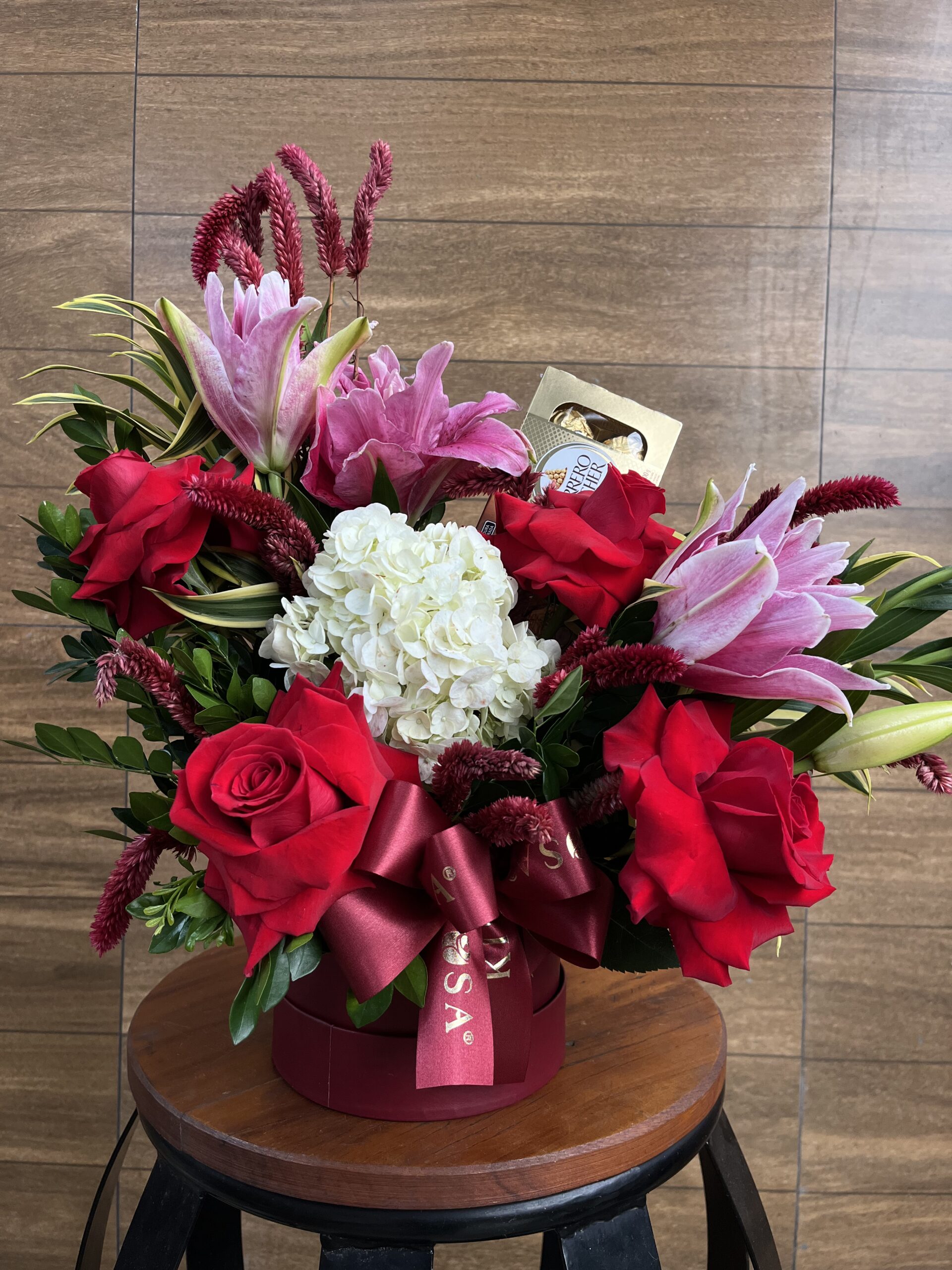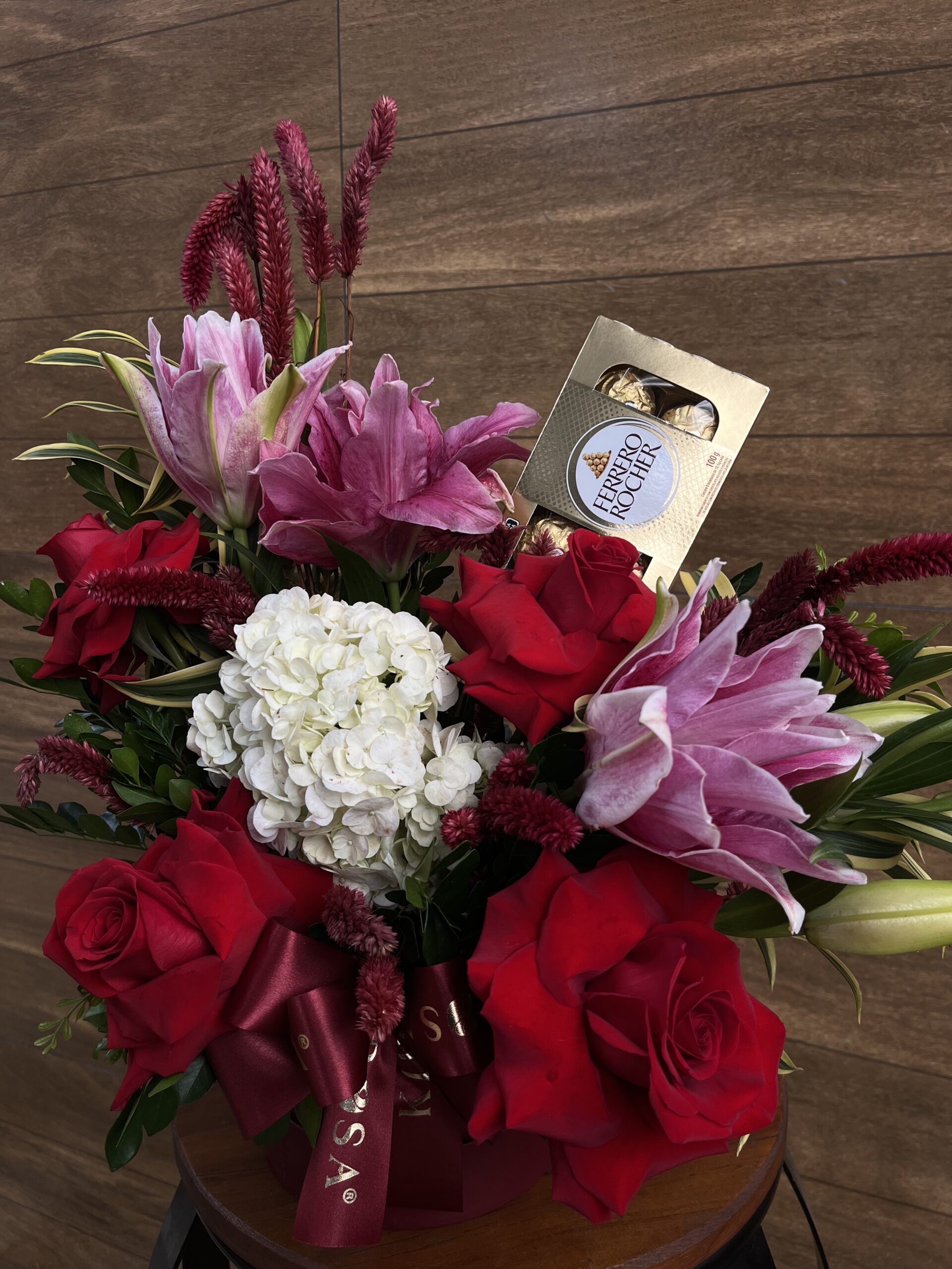 BOX Lírio dobrado, Rosa e Hortênsia Branca + Ferrero Rocher